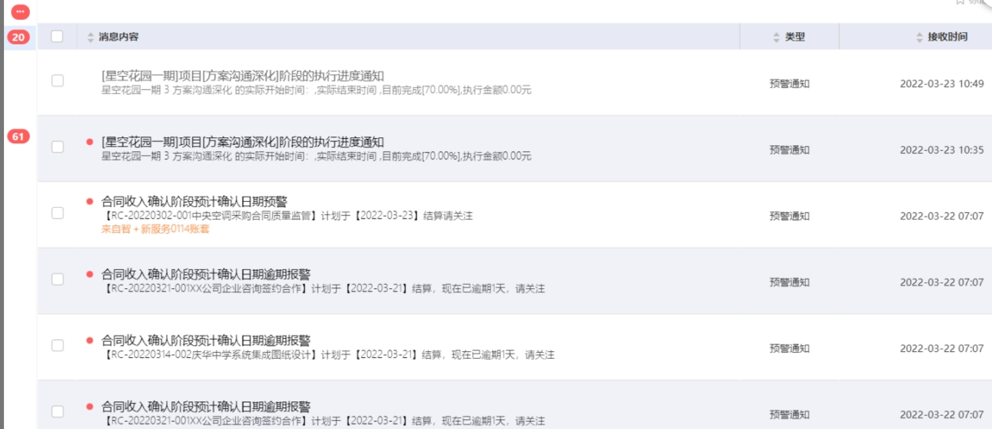 好业财项目管理系统设置了项目阶段回款计划,提供了事前/事中/事后提醒,回款逾期的功能,这样,公司能够更好地进行项目管理,及时发现问题并做出解决方案,提高了项目的运营效率,降低了企业风险。