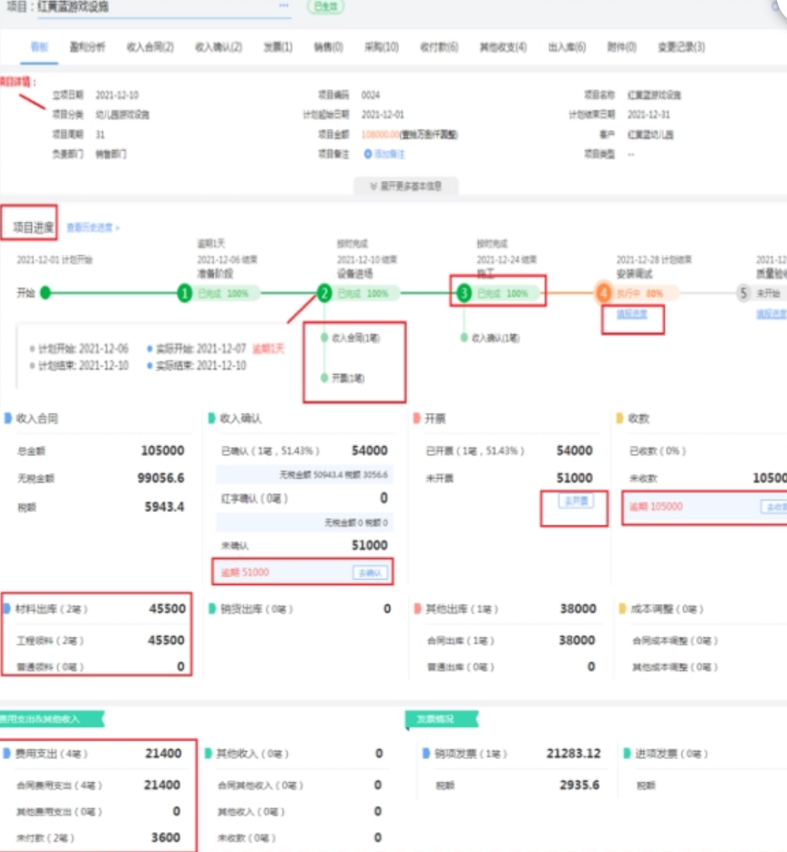 通过项目看板和收入合同工作台,公司能够实时了解每个项目的执行情况。项目看板可以实时查看项目进度、收入、回款、库存、成本、费用、发票等信息,让管理者能够随时掌握项目的情况。公司可以通过项目看板来了解每个项目的收入、支出及盈利情况,从而为项目决策提供依据。