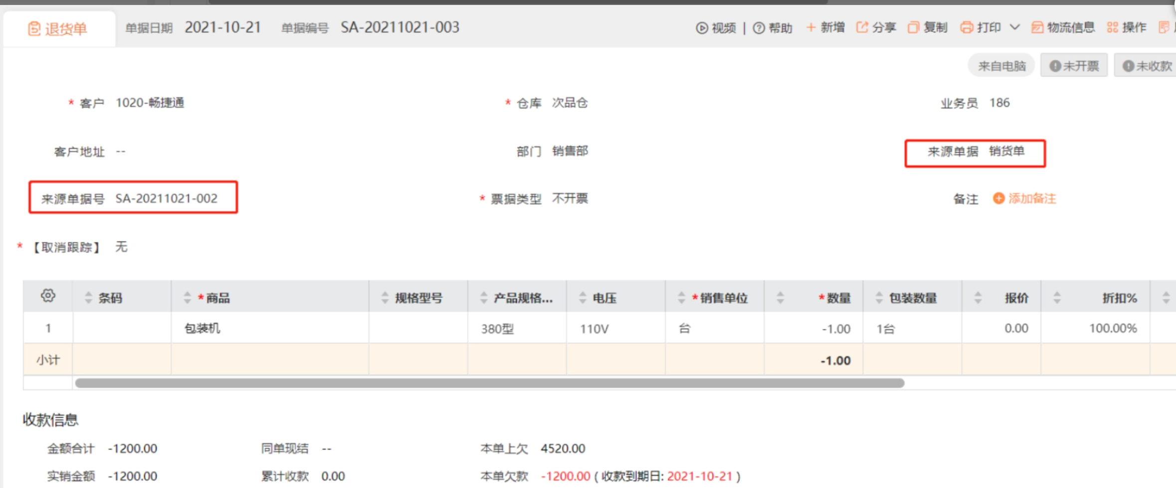 打开销货退货,点击右上角【选单】,选择销货单生成退货单。