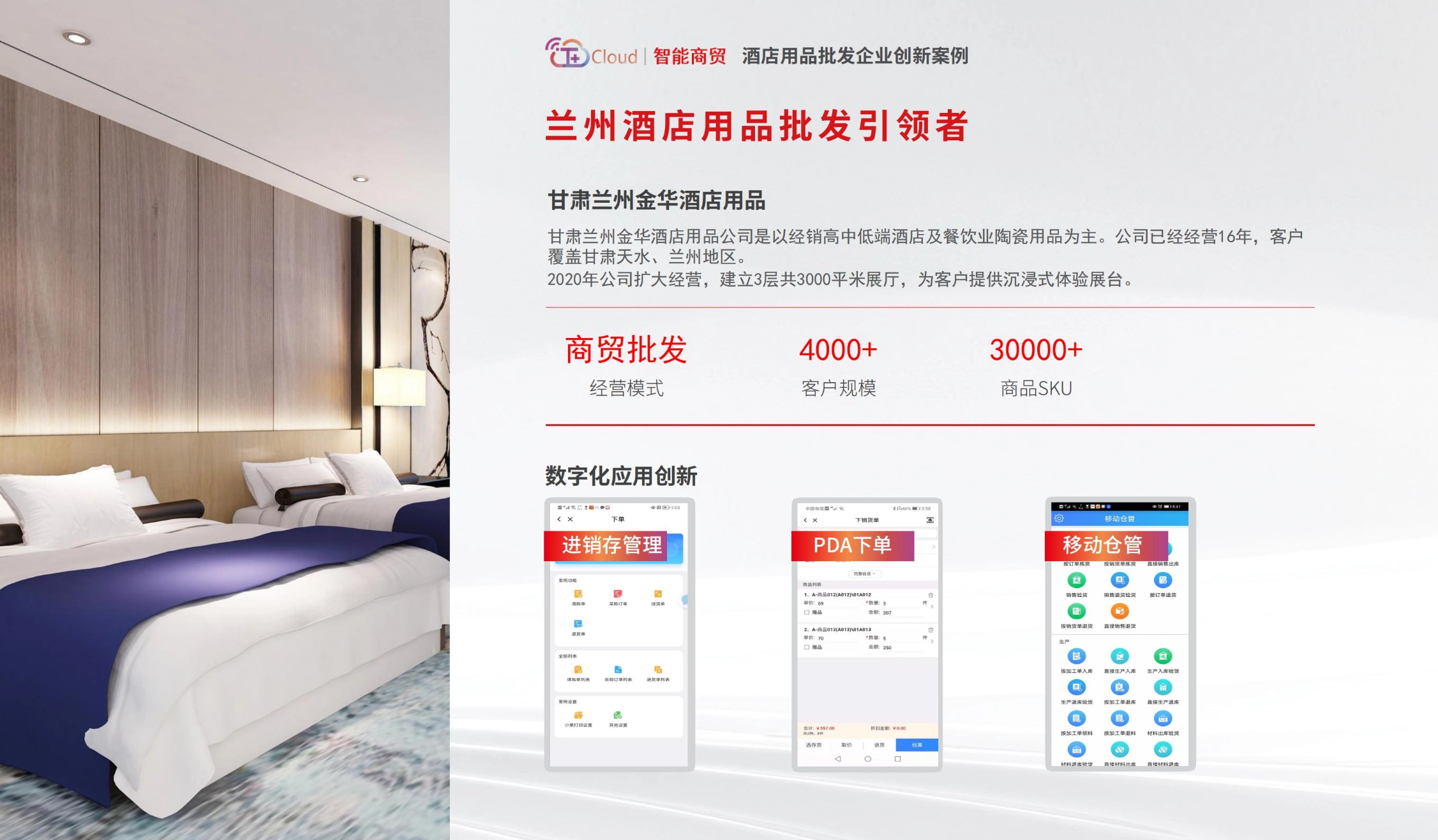T+Cloud助力酒店用品批发企业快速成长。酒店用品批发涉及采购、仓储、 销售、财务等多个环节和部门,每一个环节的优化,都提升了企业的竞争力。