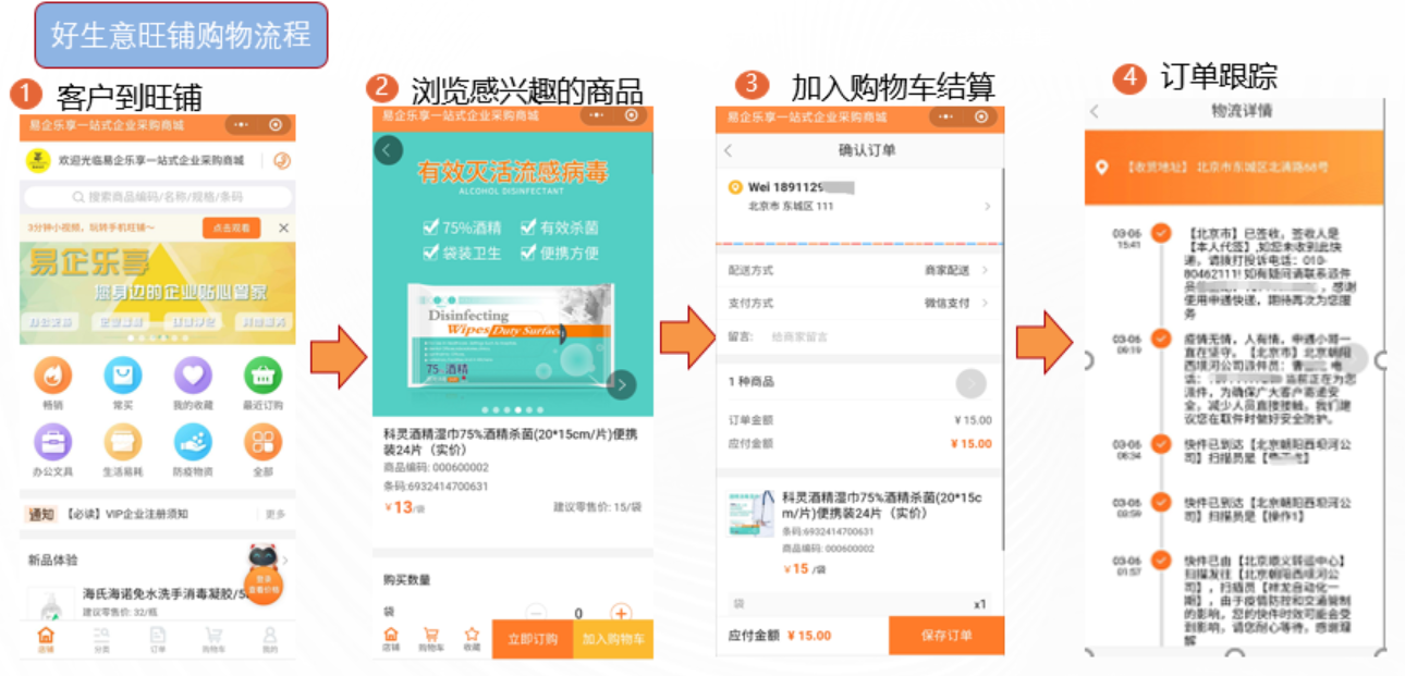 1、线上旺铺上线期间,天津易企乐享就推出了不同等级的 “防疫复工包组合”帮助企业复工,价格从几十元到上百元不等,迎合各个消费等级用户的需求,促进成单率。客户从旺铺看到了此活动,此类订单不断。