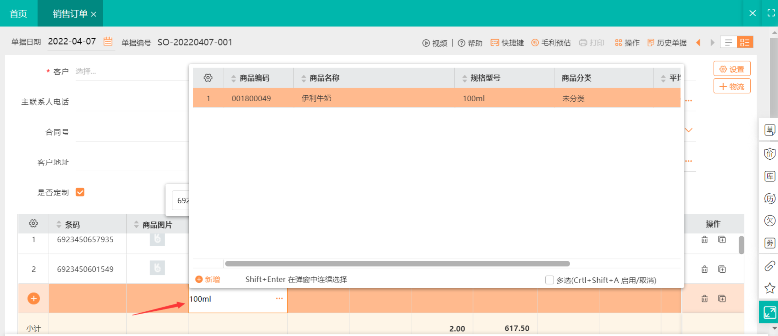业务内勤人员根据客户的需求下单时,可以直接扫大单位或小单位的条码直接开单,或者根据商品规格,商品名称摸索搜索快速开单