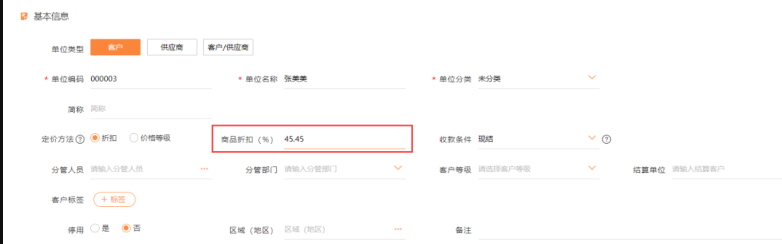 储值会员增加时,在往来单位增时,按客户的预存款计算出相应的货款金额,预存金额10万元,可拿货款22万元,相当于购买商品享受45.45折,如下图所示进行客户的增加。