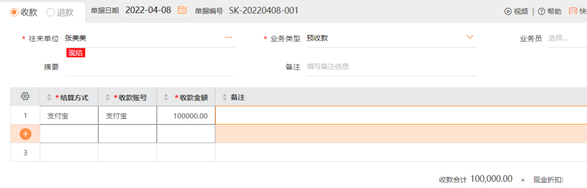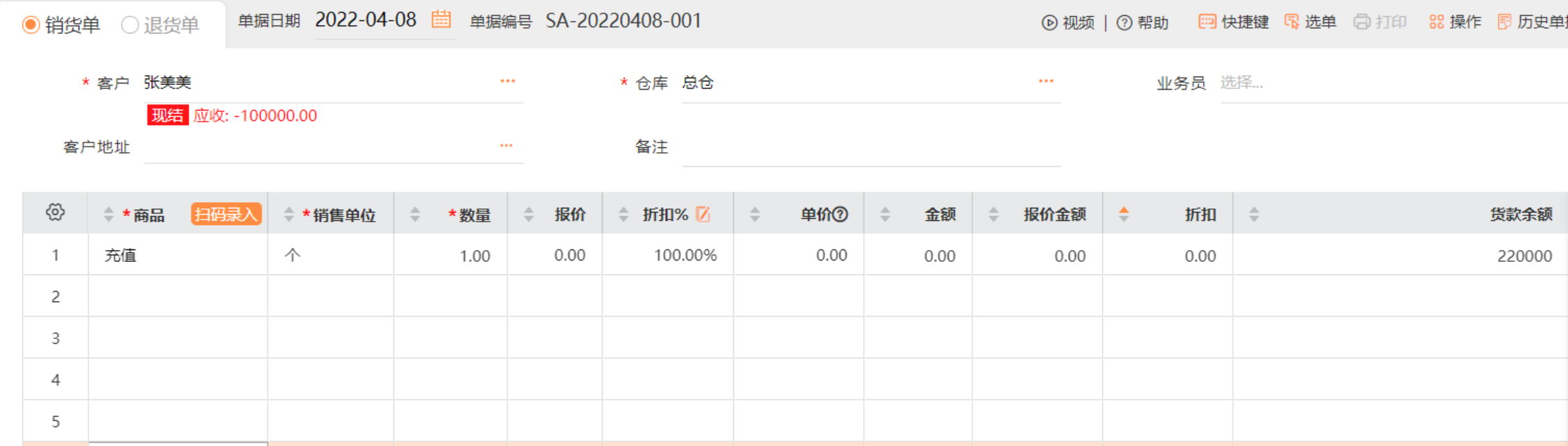 上面基础信息增加后,储值客户在充值的时候,软件中需要做一张收款单10万元,做一张销货单22万元充值的货款。