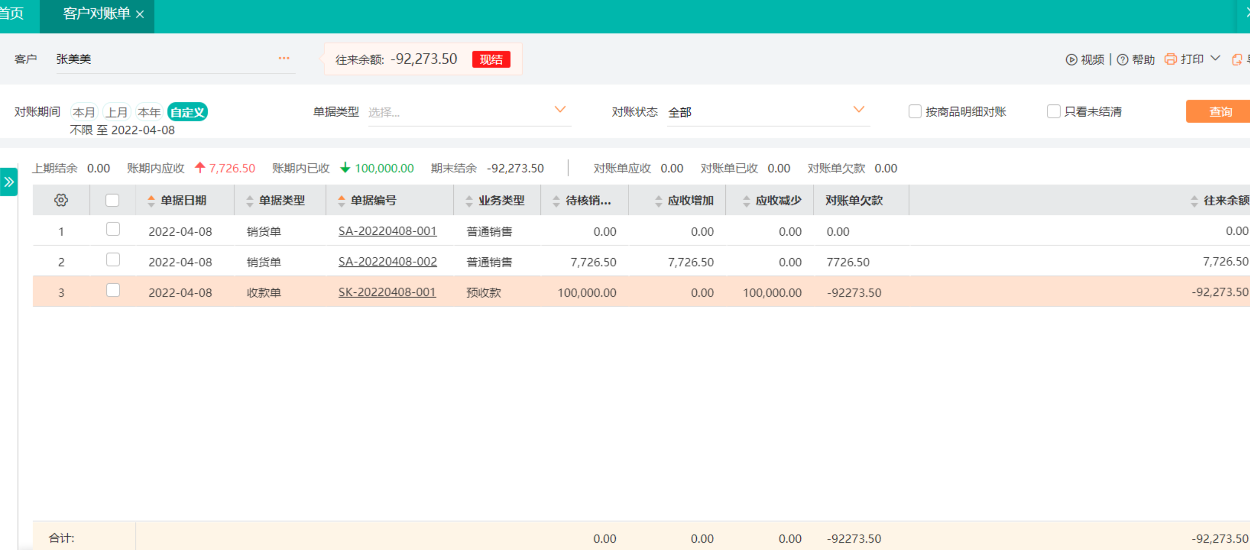查询客户 【对账单】 可以查询出客户剩余的实际预存款金额