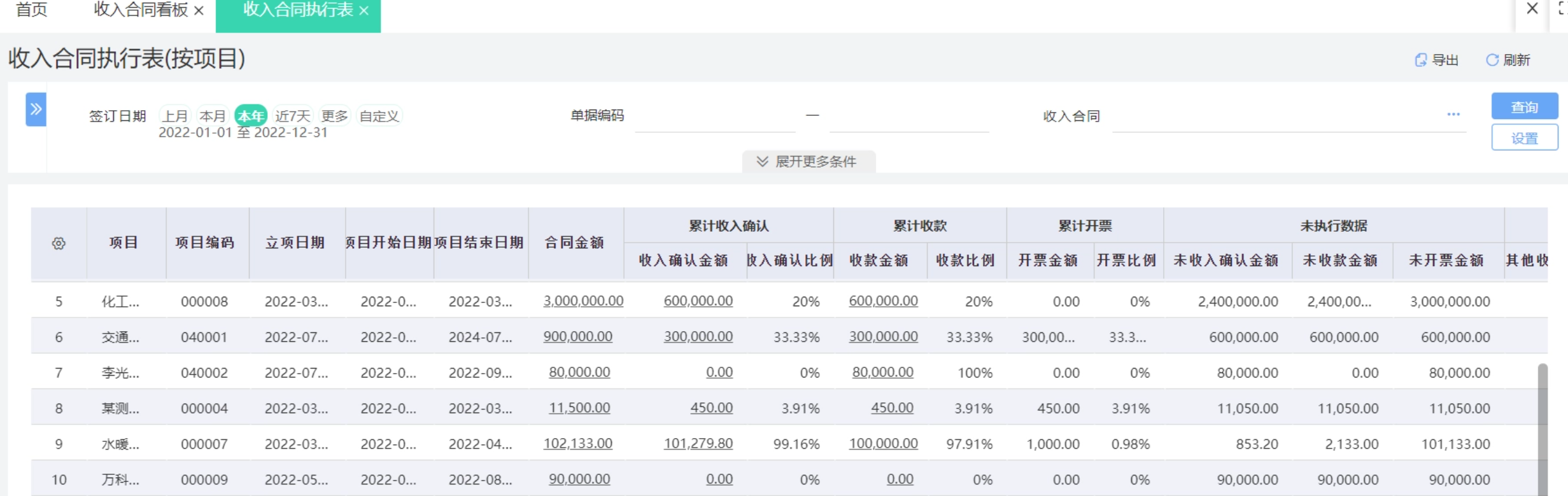 合同执行表实时查询合同金额、收入金额、开票情况、采购、出库以及费用各项数据。