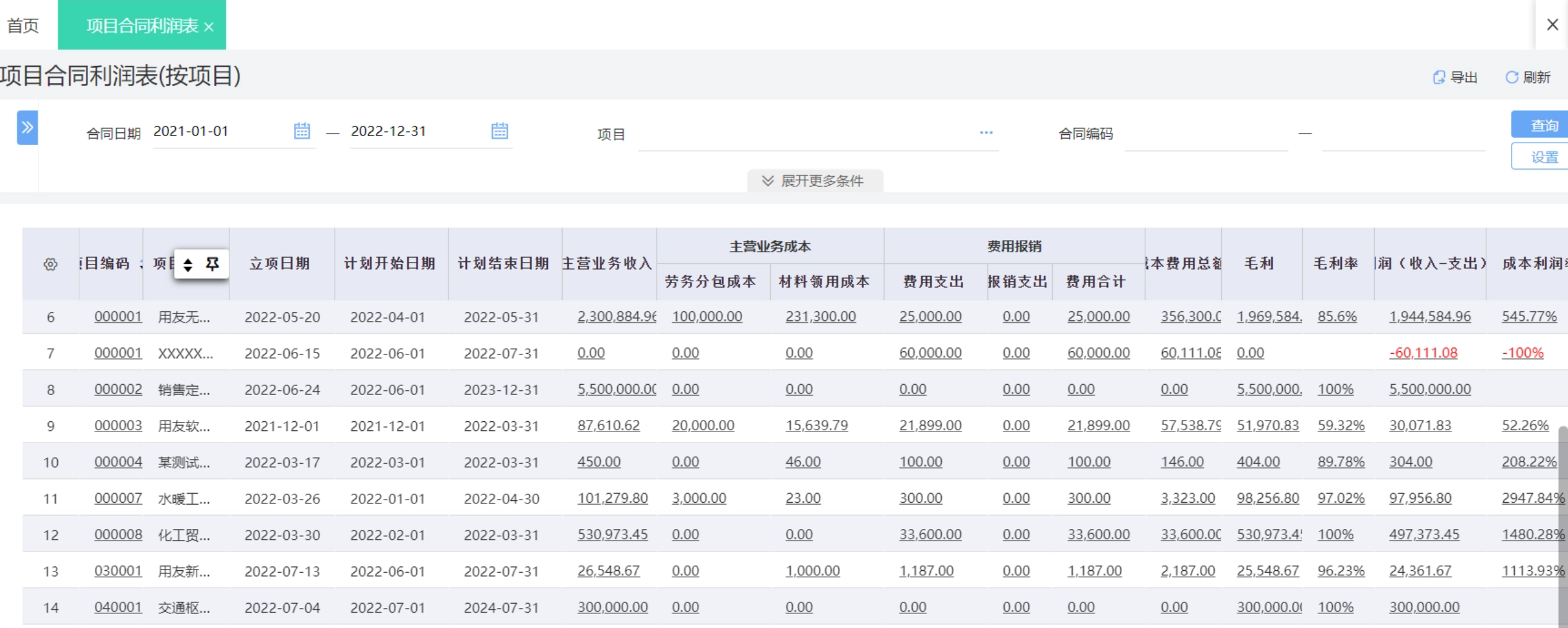 项目合同利润表同时查询每个项目合同的收入、材料成本、分包成本、费用以及利润。