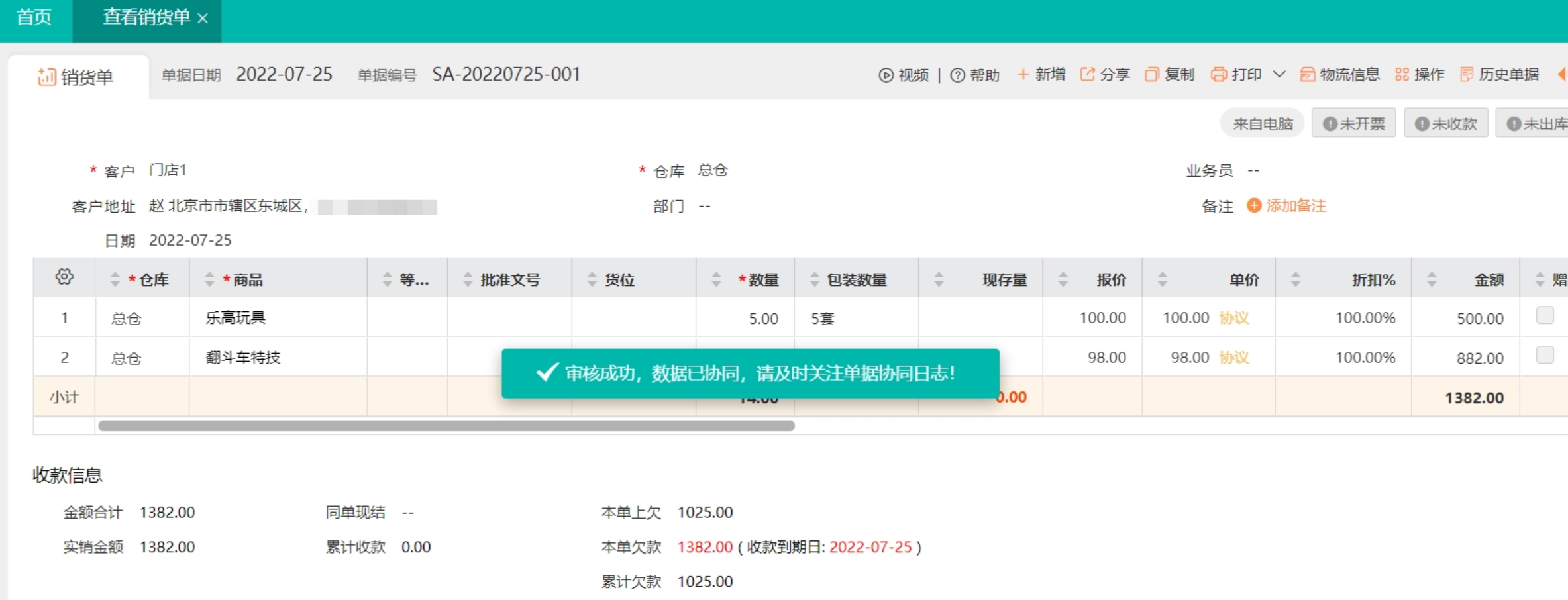 选品公司给加盟店发货时,做销货单,并协同生成加盟店账套的进货单草稿。加盟店收到货之后,通过草稿生成进货单,如果数量有异,通知上游选品公司修改数量。