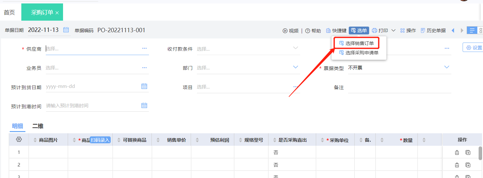 当跑店过程中发现客户需要的商品没有库存时,可以先下销售订单,通过采购订单中的选单实现快速备货下单。