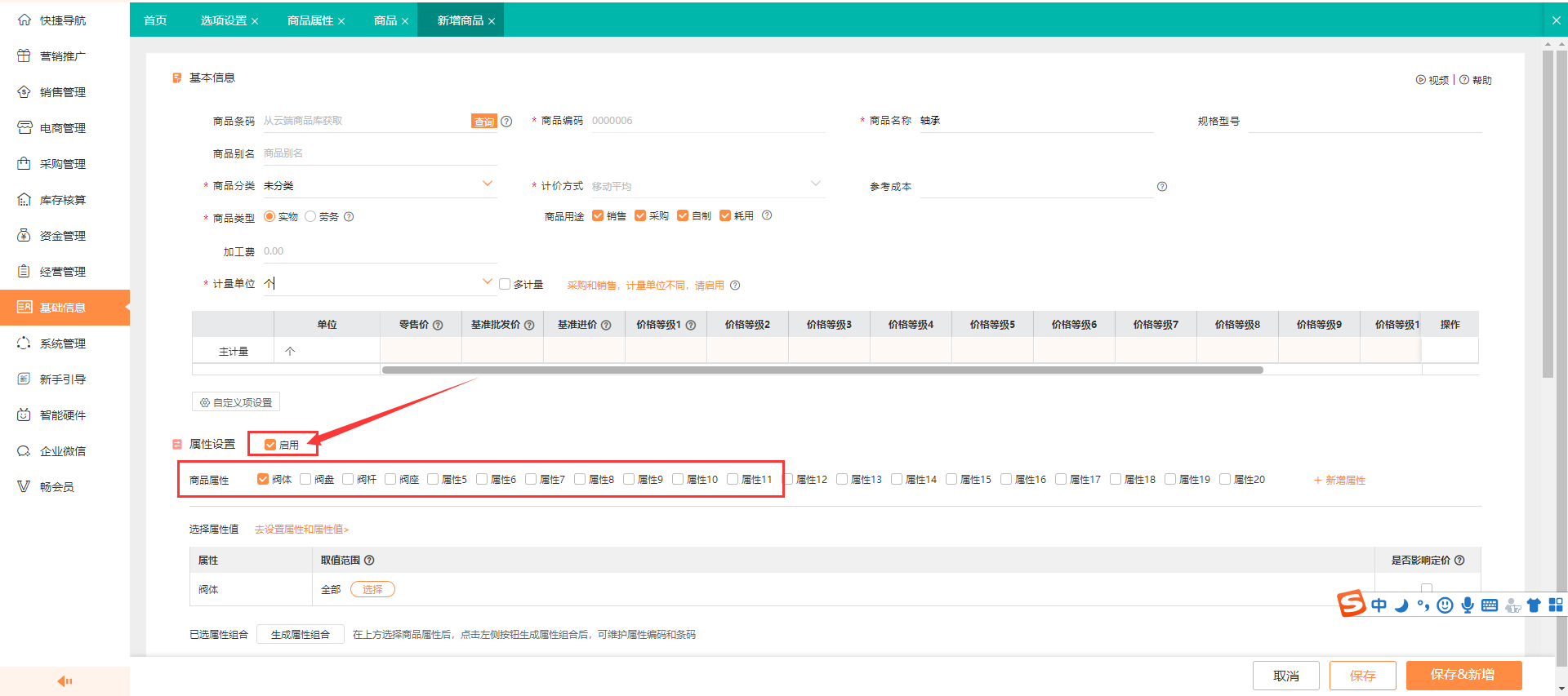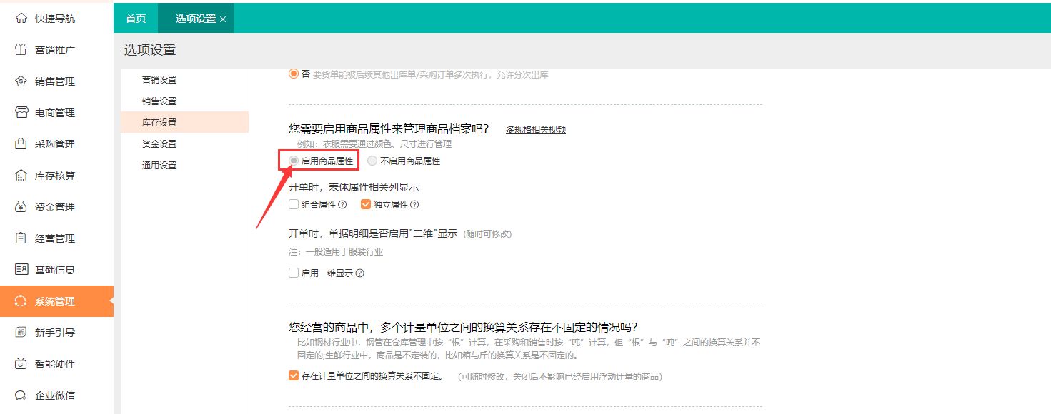 系统管理 -选项设置 -库存设置,启用商品属性设置,在基础信息中可以维护多种商品属性。