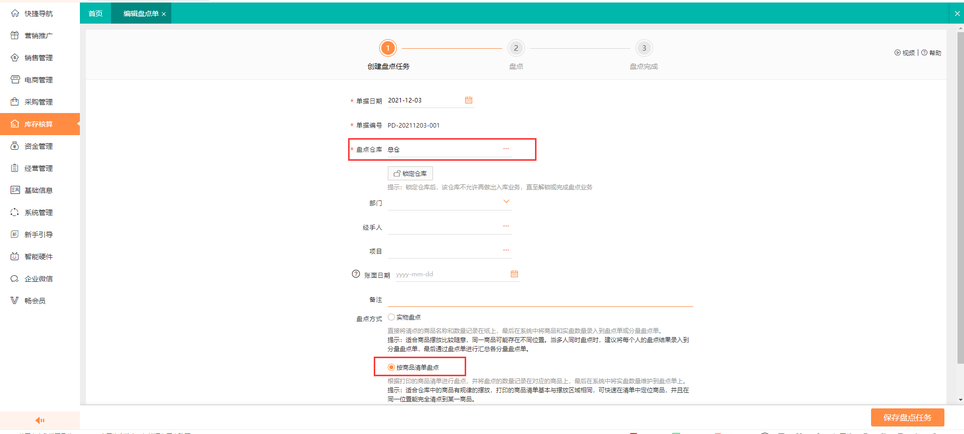 一般月底做一次盘库,可以在库存核算下做盘点单,选择盘点仓库和盘点方式: