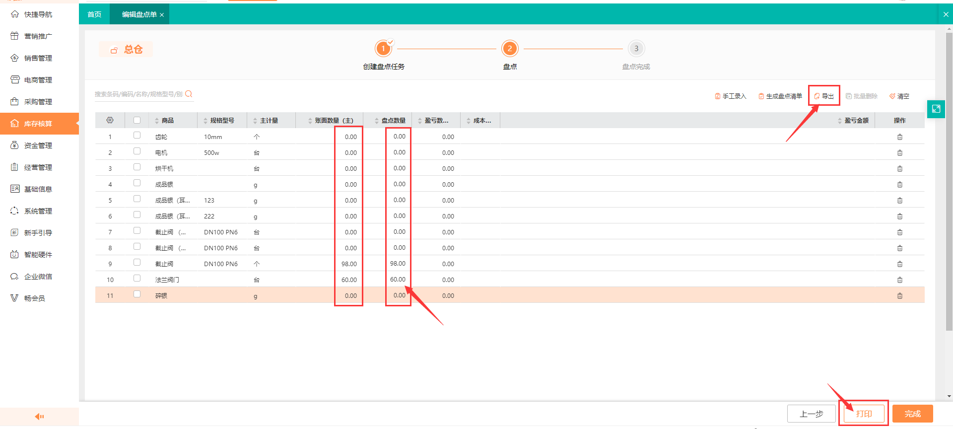 生成盘点清单后,可以把清单导出打印,盘点完成后录入盘点数量