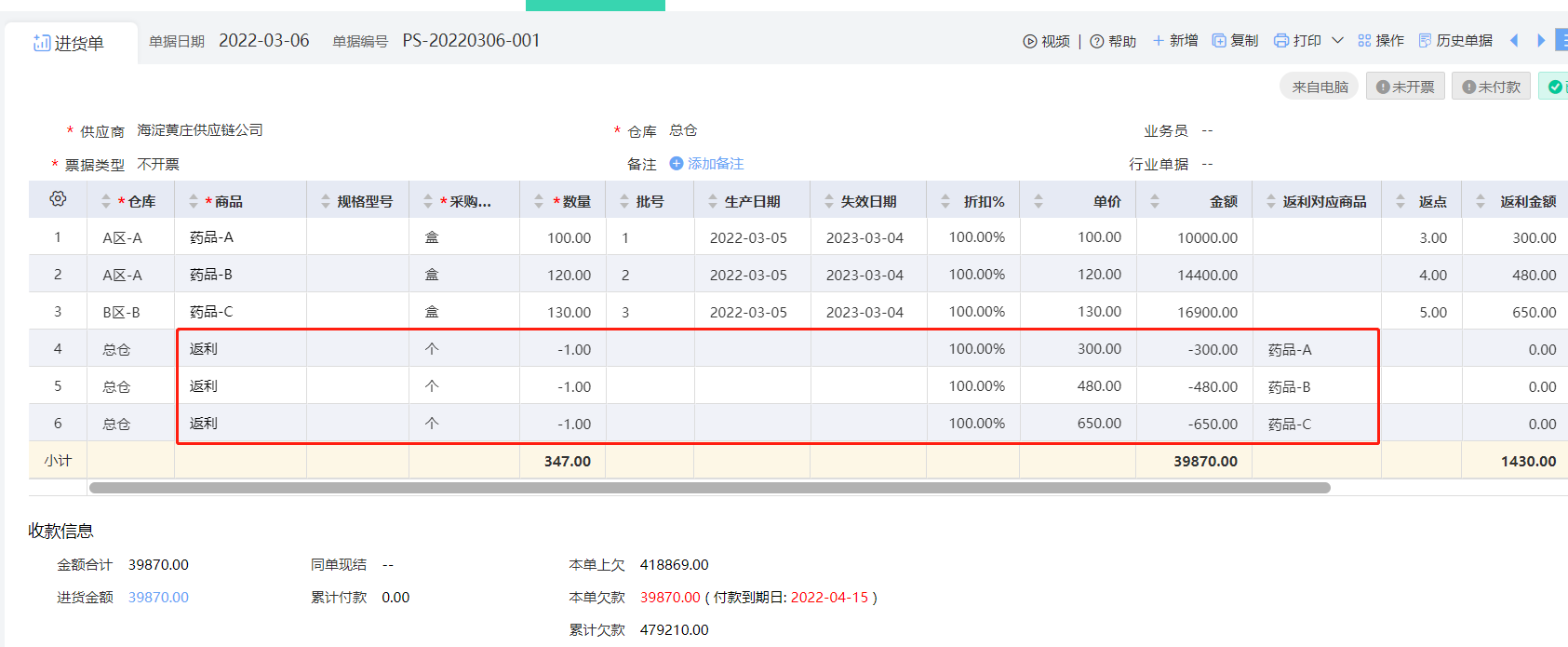 需求二、每笔返利对应详细商品,且返利要与货款分开统计