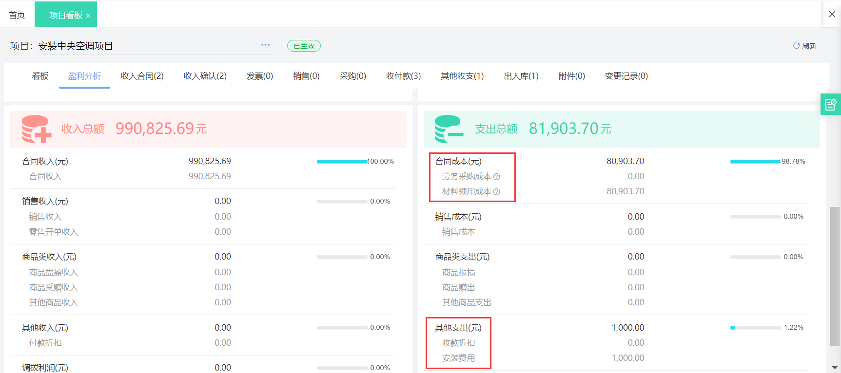 解决方案:项目看板、合同看板 盈利分析直接实时归集相关项目的材料成本、分包成本、费用,及时掌控成本是否有异常。