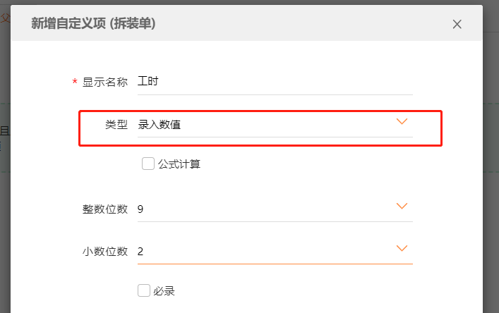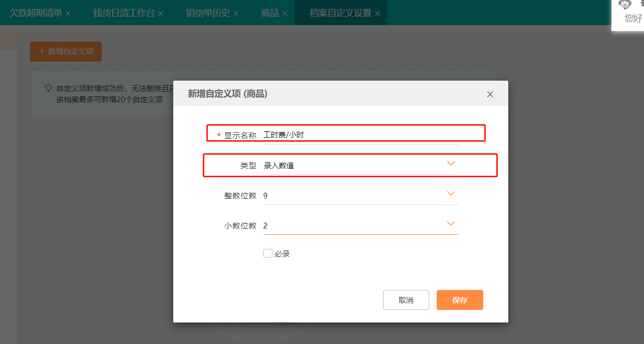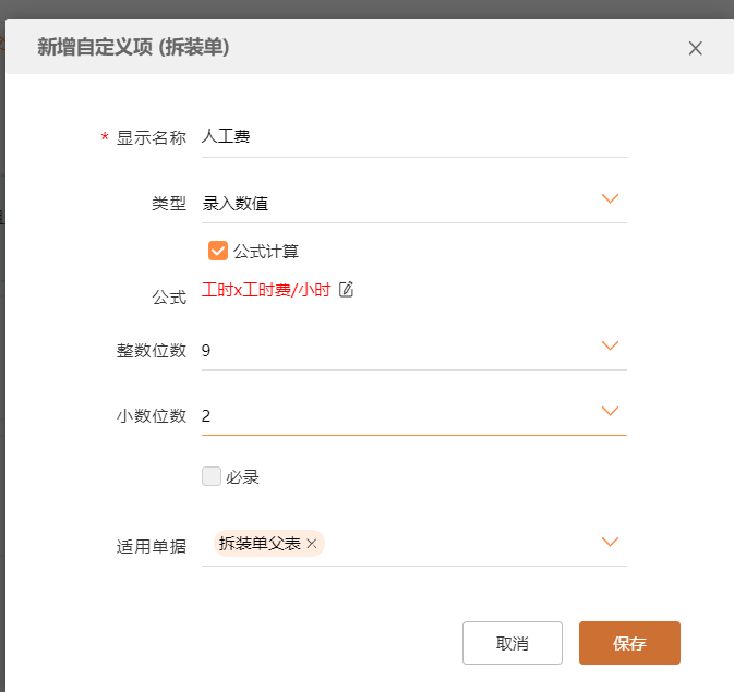 增加自定义项“ 工时费 /小时”,设置为数值类型, 2位小数。