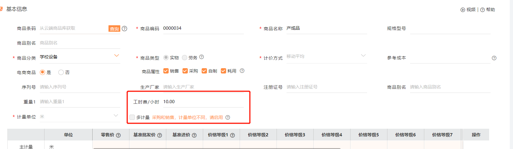 自定义设置完成,刷新浏览器,进入基础信息 -商品,录入加工产品设置对应的 工时费 /小时: