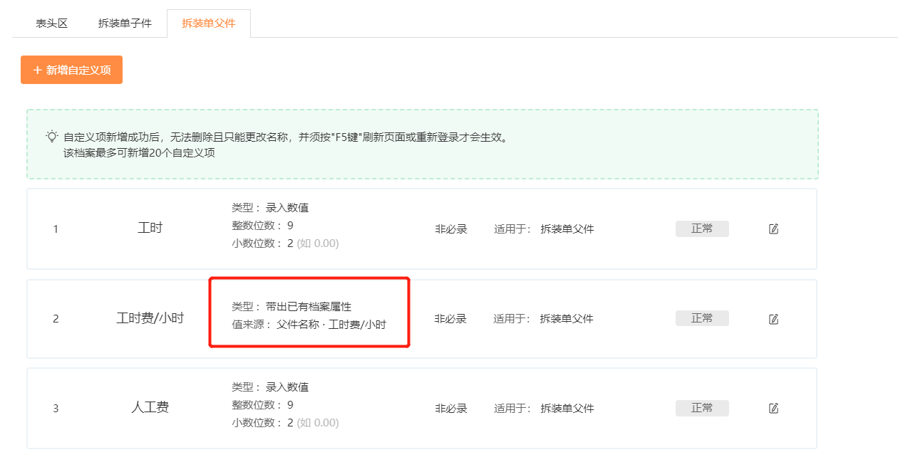 (拆装单父件)增加自定义项: