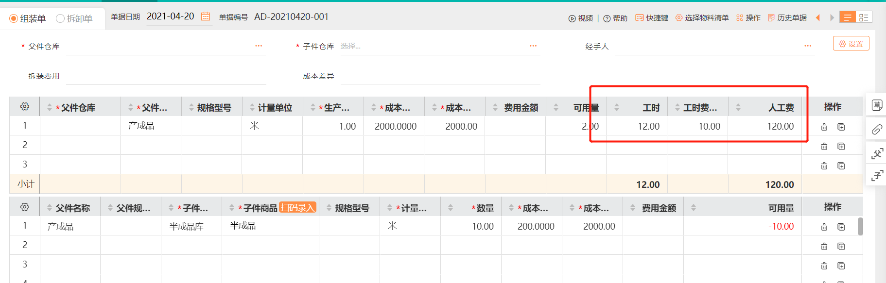 父件中录入生产产品,带出“工时费 /小时”,手工录入“工时”,软件自动计算出“人工费”