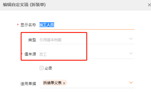 P.S:需要统计到加工人员,可以在设置拆装单增加自定义项“ 加工人员”,并设置类型与值来源;
