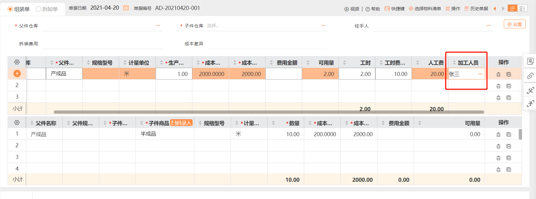 录入组装单据时,同时录入相应的加工人员即可。