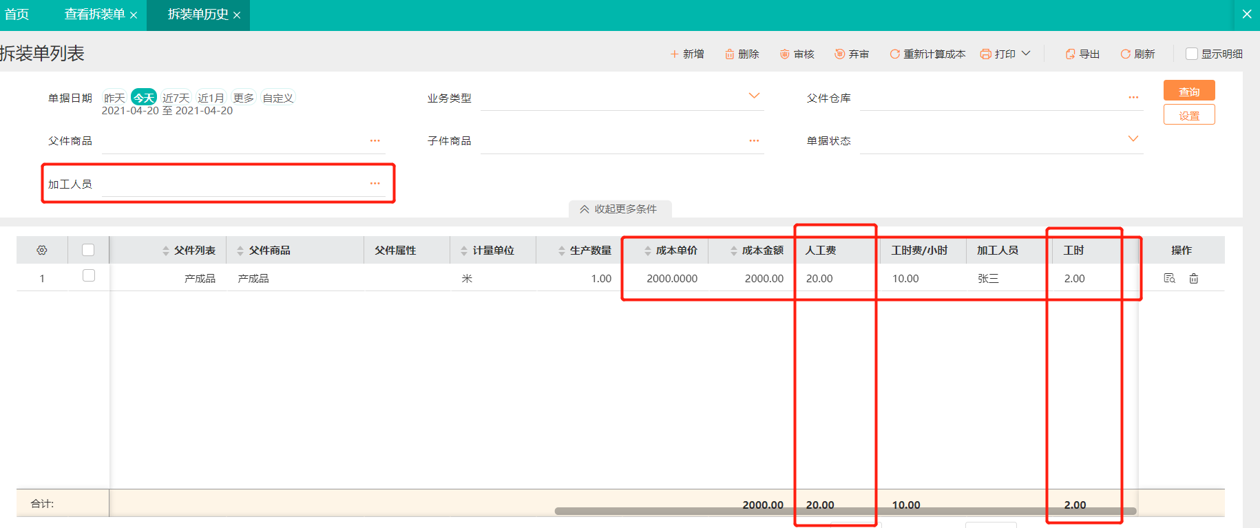 查询加工报表【拆装单历史】,就可以统计到每个产品、加工人员的工时、工时费;