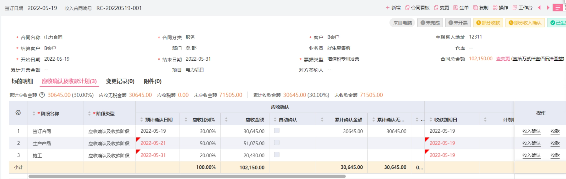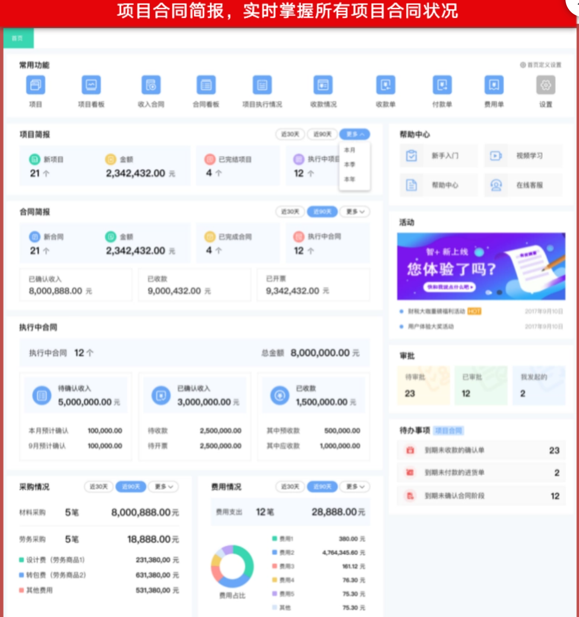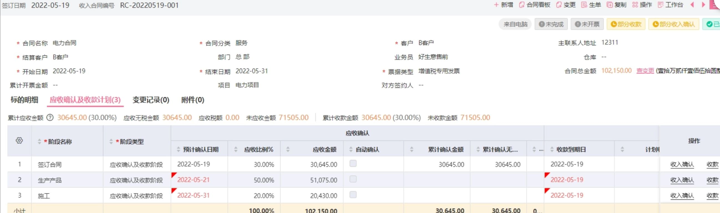 畅捷通帮助菏泽尚坤机电实现了分期分阶段确认收入与回款,财务根据合同进度对项目进行收款,系统事前/事中/事后及时预警和提醒。分类建立项目档案,合同工作台快速定位合同,项目看板实时查看合同执行相关信息,无需再单独做统计,减轻了财务39%的工作量。各项成本按项目实时归集,自动出具项目利润表、项目核算科目余额表、项目分析等报表。老板随时查看每个项目情况,项目关联合同情况、回款、项目利润等,直接了解项目经营情况。