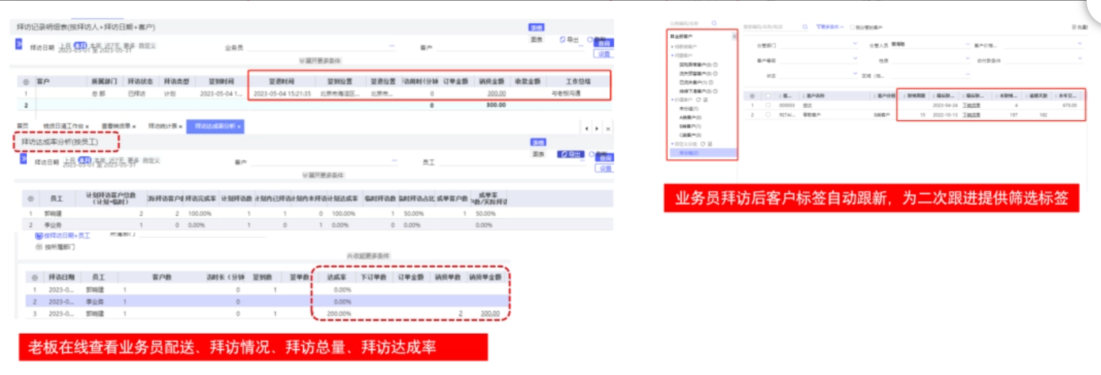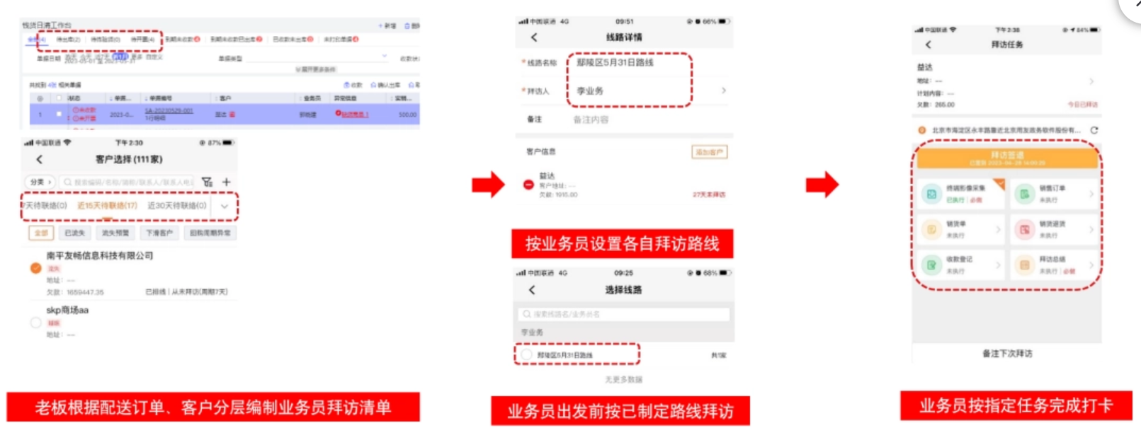 解决方案:老板根据送货清单 预设客户配送拜访路线。业务员订单配送时按规定完成客户配送 签到、 签退打卡,根据拜访规则向客户完成补货、或推广动作,除正常配送业务外,老板可根据客户状态为业务员单独指定拜访客户,将拜访用户编入配送线路中,业务员按规定完成指定客户的拜访,老板通过 拜访记录明细表快速掌握订单配送执行情况和客户拜访情况。