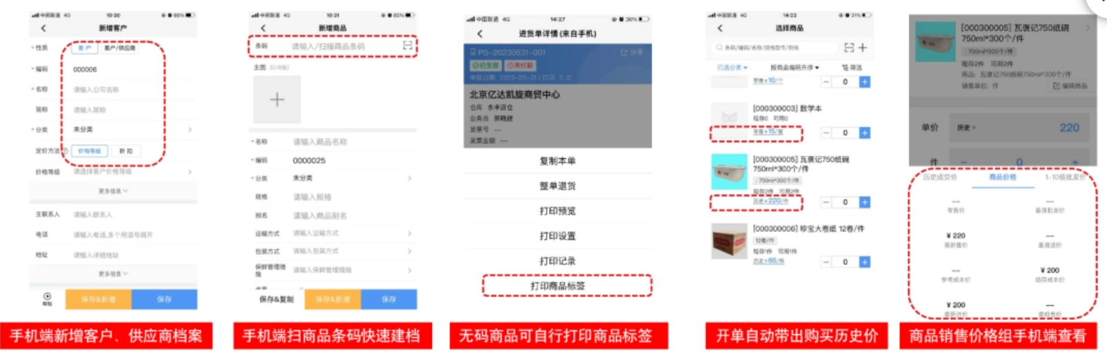 解决方案:客户可以在好业财 APP进行客户、供应商、商品 快速建档、客户销售时 历史采购价、等级价, 自动带出辅助业务员快速报价。