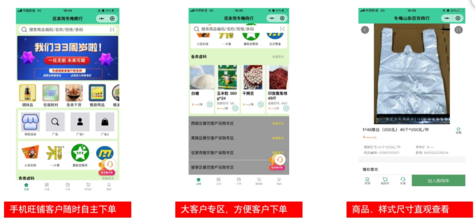业务难点 3:受业务人员文化水平、系统便利性、客户线上下单等因素影响,大部分销售开单录单工作都集中在老板娘身上,老板娘工作量大。部分商品客户需要看图片,要了解商品多个具体尺寸与规格,需要与业务人员反复沟通,沟通成本高。业务员平均负责客户量较大,重点大客户服务响应及时性不够。 解决方案:开通好业财旺铺商城, 引导客户自主在线下单,老板仅需在后台进行审核, 无需二次录单轻松销售,旺铺开设大客户常购专区,大客户快速选购自己常购商品不需要再反复筛选下单,方便客户在线下单;将 商品详情图上传至商城,客户便捷了解所需购买商品尺寸与规格 无需反复沟通确认。