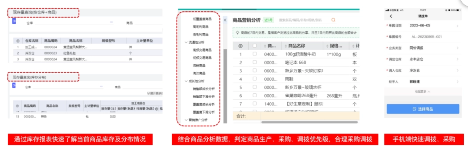 ( 1)客户通过好业财 库存分布表、 现存量表以及 商品分析、 智能补货功能可以快速制定商品生产、调拨、采购计划。通过好业财手机端可快速完成商品采购、调拨等业务操作。