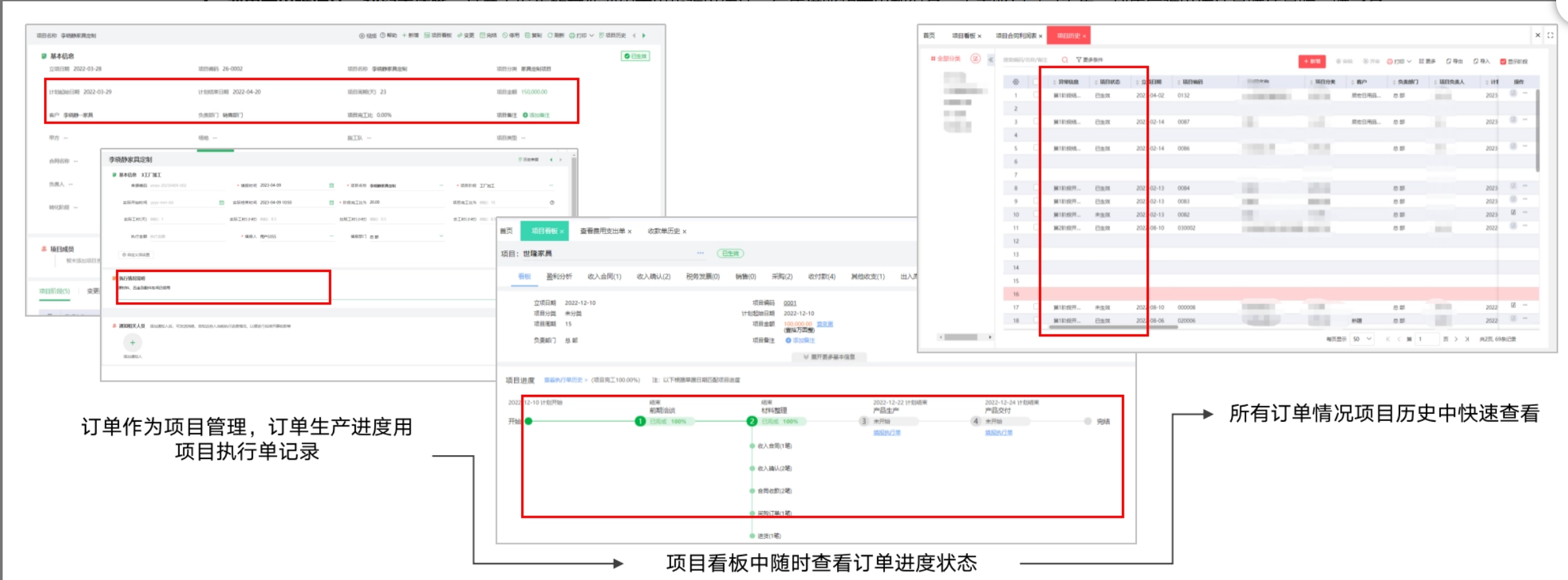 解决方案:订单作为项目管理,订单生产进度用项目执行单记录,项目看板中可以随时进行查看每个订单的进度状态,项目历史里可以快速查看当下所有订单的情况。