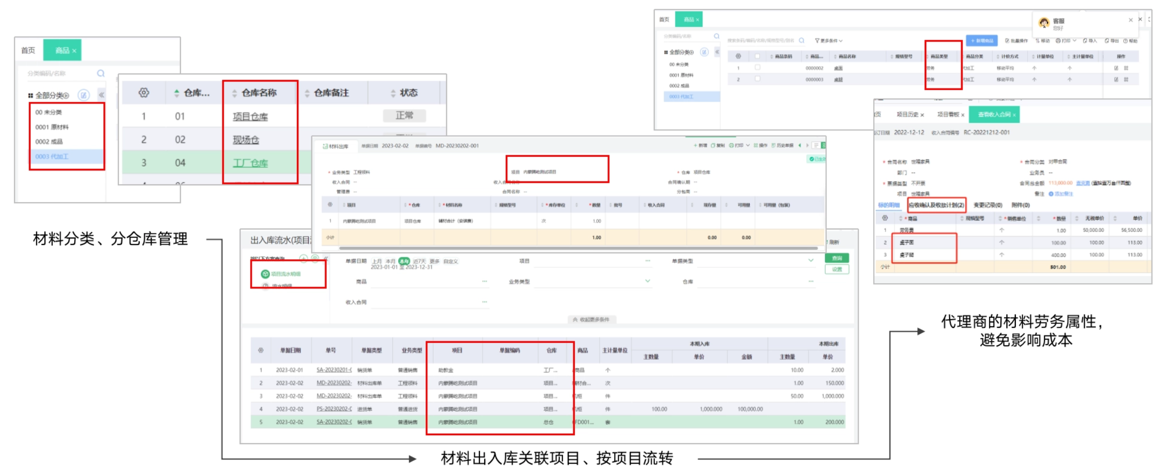 管理诉求:库存及成本管控难:仓库中既有自己的材料、又有代理商送来的材料,材料出入库用手工单据记录,账面库存与实物经常对不上;自己采购的材料有成本,代理商的材料无成本,库存成本杂乱、利润不准。 解决方案:材料分类、分仓库管理,材料出入库关联项目、按项目流转,同时将代理商送来的材料做成劳务性质的商品,这样既可以在合同中记录标的明细,也避免影响自己的库存的成本。