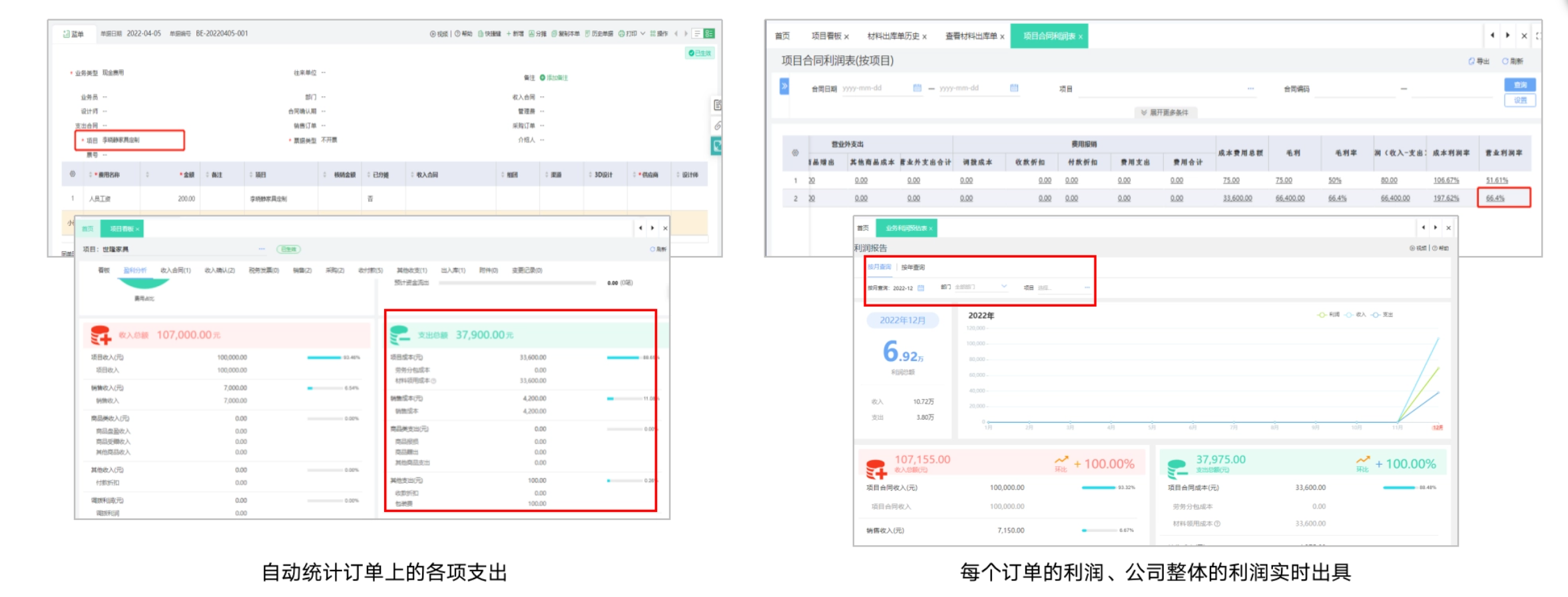 解决方案:费用支出单关联项目(订单),系统自动统计订单上的各项支出;每个订单的利润、公司整体的利润,系统报表自动出具。