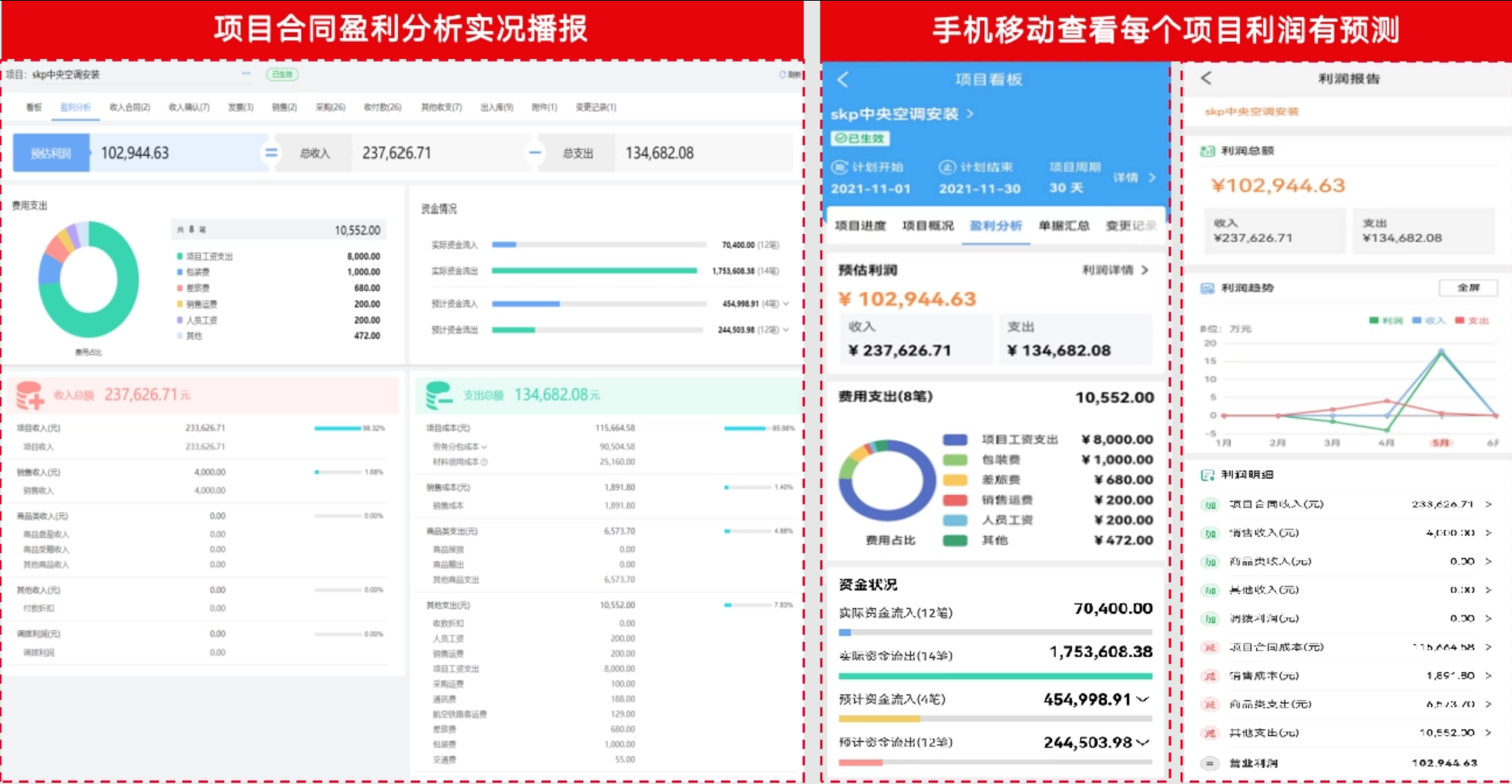 按项目随时了解项目的收入和支出情况,对项目利润有预测,实时掌握项目相关的收入明细和支出成本明细项,对项目盈利能力有分析,通过手机端、电脑端每个项目盈利分析实时播报。